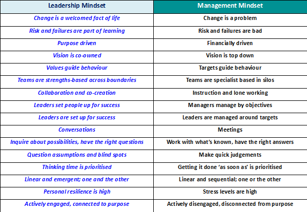 It’s likely that you recognise your organisation in both metaphors. The interesting reflection for you in your leadership role is which is dominant and does that push you more to management or to leadership. Most people in organisations that have either title manager or leader do both. The point is to think about balance and really question yourself about where you sit on the leader-manager continuum.