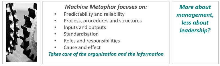 This metaphor has proved to be extremely durable and powerful in influencing our understanding of organisations and how people behave in organisational settings. The majority of leaders, managers and individuals, whether they realise it or not, carry this idea of an organisation into every organisational interaction. Many of the principles and underlying assumptions that accompany this metaphor appear to have penetrated every aspect of organisational belief, language and behaviour.