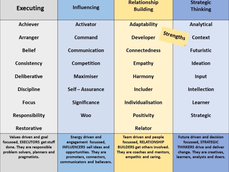 - Executing: People with strengths in this key domain know how to rally around a goal and get things done. Differing strengths might dictate the style of getting to the goal, but people who have strengths in this area make a massive contribution to things happening.